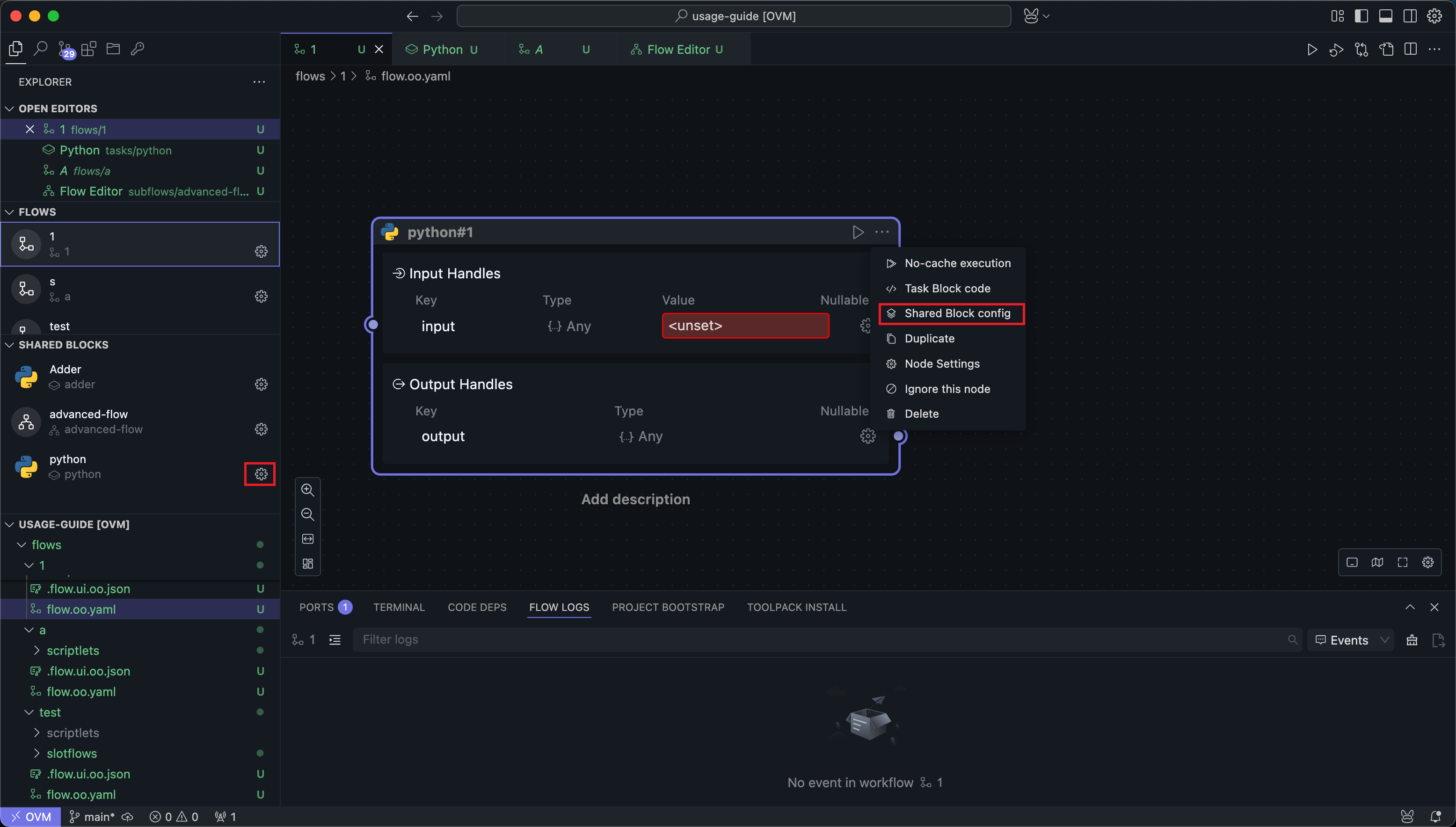 Task Block Nodes have a Configure Shared Block menu item. Click it to enter the shared Block configuration.
